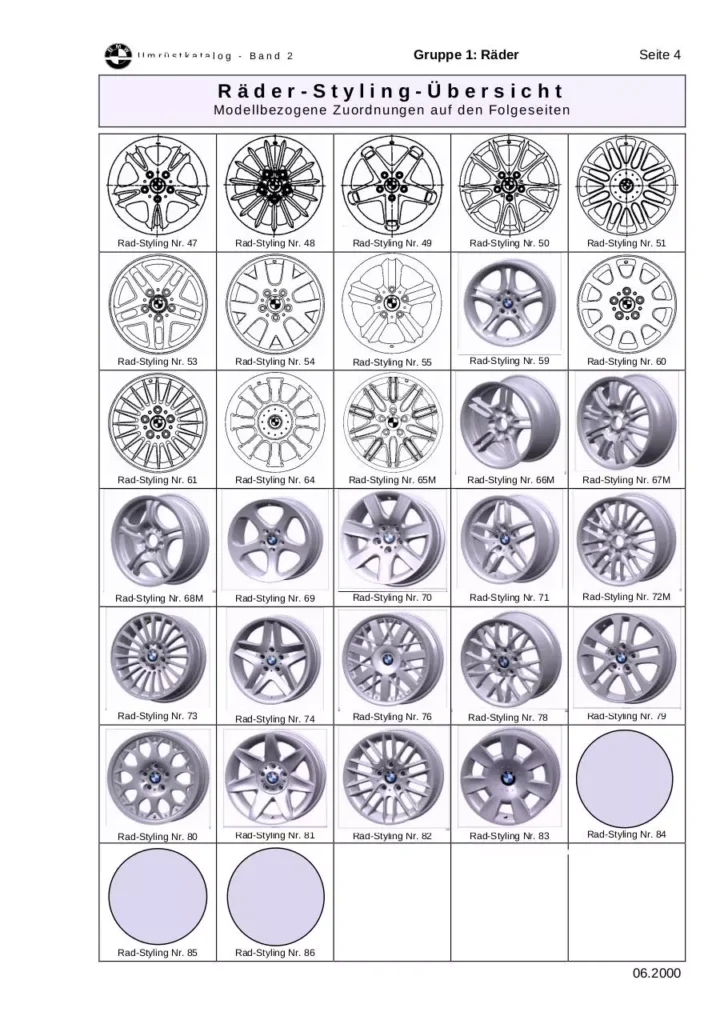 Diese BMW Felgenkatalog bietet Ihnen eine umfangreiche Übersicht über unser interessantes Sortiment an Original BMW Leichtmetallrädern, die Sie an ihrem attraktiven Design und ihrer überragenden Materialqualität sofort erkennen können. Unser Broschüre präsentiert eine Vielzahl von Optionen, wie zum Beispiel den BMW E36 Felgen Katalog und den BMW Felgenkatalog 19 Zoll, die speziell für verschiedene Modelle und Anforderungen konzipiert wurden. Zusätzlich finden Sie in diesem Verzeichnis nützliches Informationsmaterial wie das BMW Traglastgutachten PDF, welches Ihnen alle notwendigen Details zu den Tragfähigkeiten der Felgen bietet. Erkunden Sie unser Archiv und entdecken Sie die perfekte Felge für Ihr Fahrzeug.